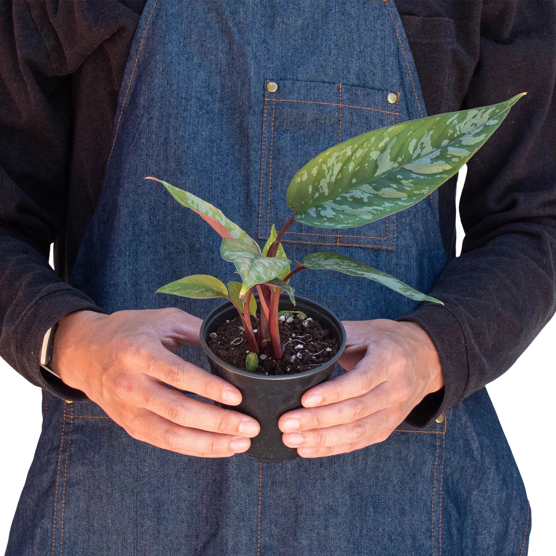 - Description: A beautiful collector's plant with dark green foliage splashed with silver-grey markings and purple-tinged undersides, ribs, and stems.
