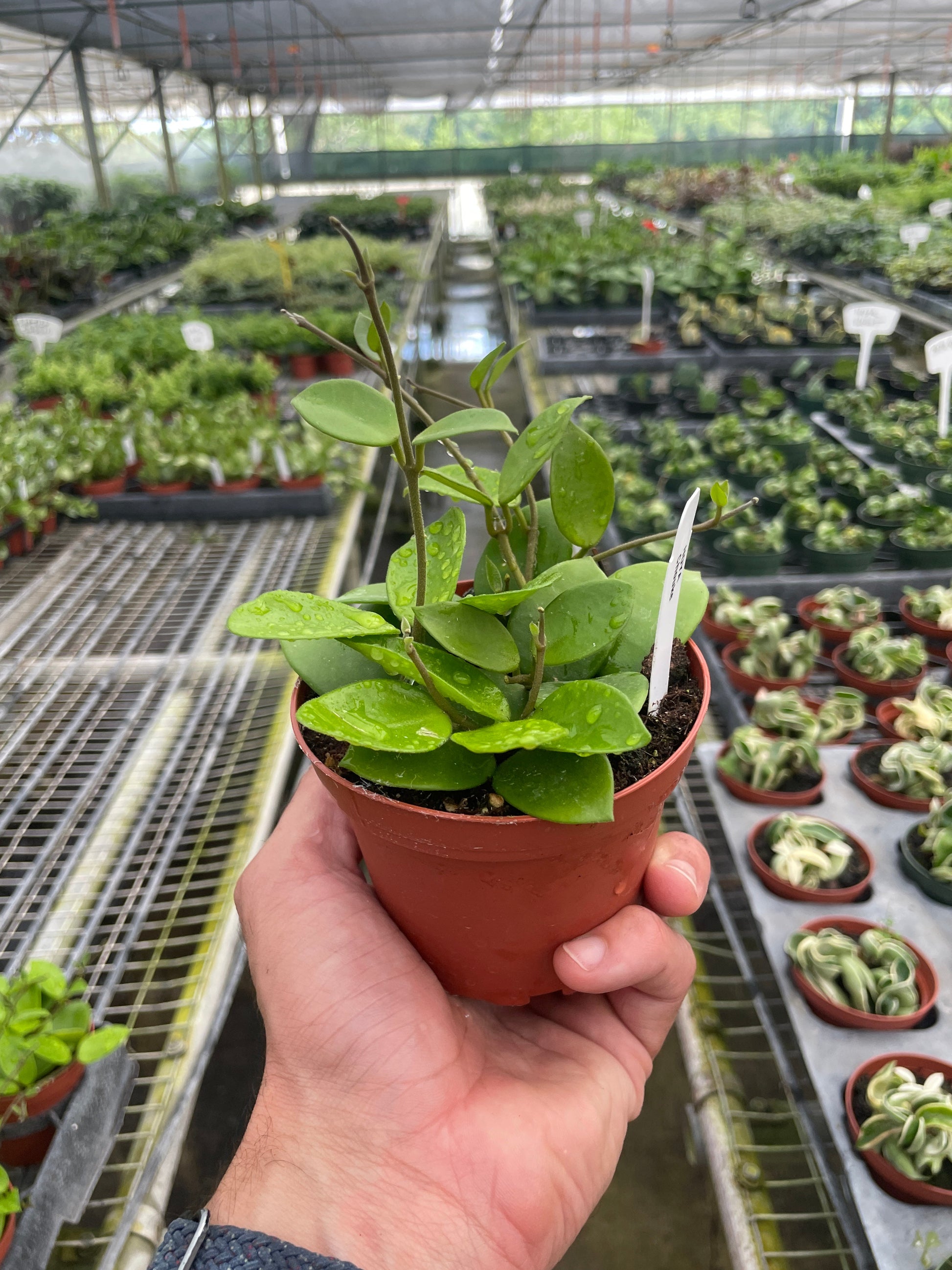 - Hoya bilobata leaves are usually 1.7–2.2 cm long and 1.3–1.8 cm wide, with a sub-orbicular or elliptic shape and rounded leaf bases and apexes. The leaves are a dull olive green on top and a lighter green underneath, and can develop dark margins.