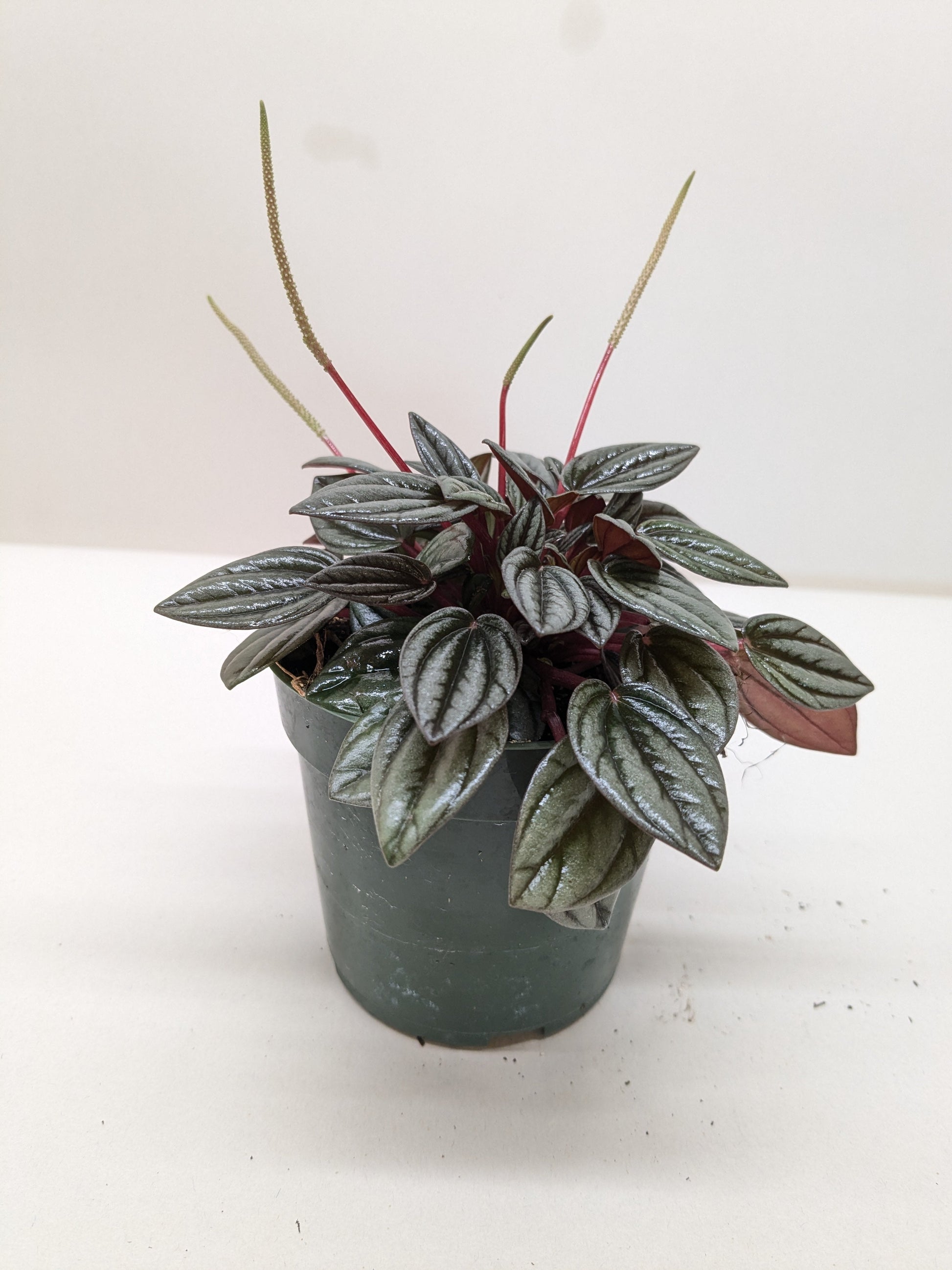 Description: Peperomia ‘San Marino’ features deeply textured, heart-shaped leaves with a rippled surface. The foliage has a cool-toned, silver-green color with darker green veins that create a soft, metallic sheen. Its compact, mounded shape makes it a tidy tabletop plant with a lush, elegant appearance.